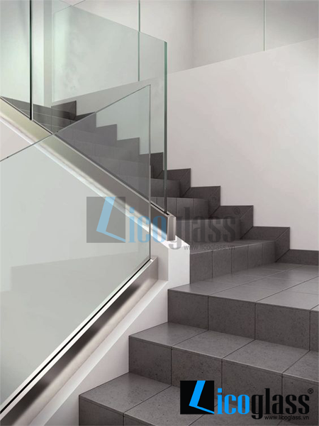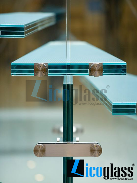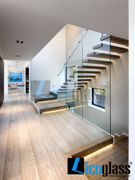 Cầu thang kính kết hợp mặt bậc gỗ sồi cao cấp